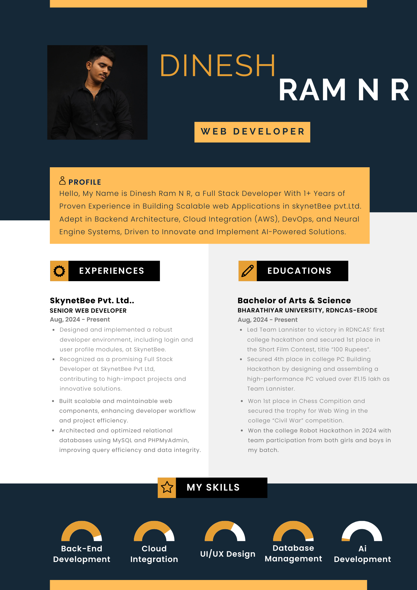 I’m Dinesh Ram N R, a results-driven Full Stack Developer passionate about building high-performance, secure, and scalable web solutions. I specialize in crafting responsive, user-focused applications with cutting-edge technologies across front-end and back-end architectures. My expertise spans HTML, CSS, JavaScript, PHP, MySQL, and modern frameworks, complemented by experience in cloud technologies like AWS for deployment and scalability. I thrive in hackathon environments, where speed and precision meet innovation. Beyond code, I channel creativity through professional video editing in DaVinci Resolve, merging technical excellence with visual storytelling. Dedicated to continuous learning, I push boundaries to transform complex ideas into powerful digital experiences that inspire and deliver impact.
